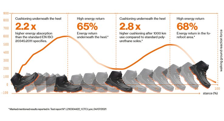 A shoe or boot with multi-layer-shock absorption technology is advisable, as this will provide increased walking comfort. uvex makes use of dual-density polyurethane to achieve this anti-fatigue safety shoe.